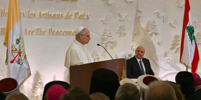 وقال بابا الفاتيكان في كلمة له من قصر بعبدا الرئاسي، الأحد، مُخاطبًا الرئيس جوزاف عون والحضور: “طﻮﺑﻰ ﻟﻔﺎﻋﻠﻲ اﻟﺴﻼم. إنه ﻟﻔﺮح ﻛﺒﯿﺮ ﻟﻲ أن أﻟﺘﻘﻲ ﺑﻜﻢ وأزور ھﺬه اﻷرض، ﺣﯿﺚ اﻟﺴّﻼم هو أﻛﺜﺮ ﻣﻦ ﻣﺠﺮّد ﻛﻠﻤﺔ: اﻟﺴّﻼم هنا هو ﺷَﻮق وهو ﻣﺼﯿﺮ، وهو ﻋﻄﯿﺔ وورﺷﺔ ﻋﻤﻞ ﻣﻔﺘﻮﺣﺔ داﺋﻤًﺎ. أﻧﺘﻢ ﻣﻜﻠﱠﻔﻮن ﺑﺎﻟﺴّﻠﻄﺔ ﻓﻲ ھﺬا اﻟﺒﻠﺪ، ﻛﻞّ ﻓﻲ ﻣﺠﺎله اﻟﺨﺎصّ وﺑﺄدوار ﻣﺤﺪّدة”.