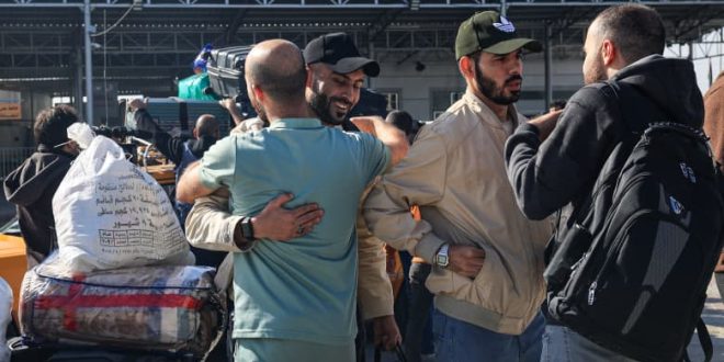 – عاد 67 فلسطينيا كانوا عالقين في مصر خلال الحرب بغ-زة، إلى القطاع الجمعة بعد ساعات من دخول الهدنة حيز التنفيذ، وأعلنت السفارة الفلسطينية في القاهرة، الخميس، أنه سيتم السماح للفلسطينيين العالقين في شبه جزيرة سيناء بالعبور إلى غ-زة يوم الجمعة. وأضافت السفارة أنه سيتم السماح للفلسطينيين الآخرين الموجودين في أجزاء أخرى من مصر بالعبور إلى غ-زة اعتبارًا من يوم السبت إذا رغبوا في ذلك.