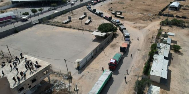 وفتحت إسر-ائيل معبر كيرم شالوم/كرم أبو سالم، الثلاثاء، أمام عمليات تفتيش المساعدات دون السماح بدخولها إلى غ-زة. ويتم فحصها قبل إرسالها إلى معبر رفح بين غ-زة ومصر لتسليمها إلى المنظمات الدولية ونقلها إلى القطاع.