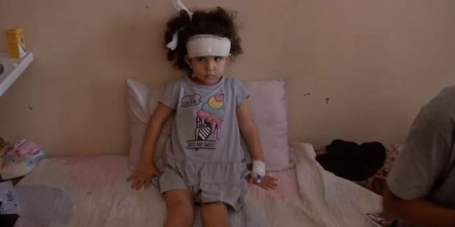 جبهتها ملفوفة بالضمادات، ولا تزال قطعة من الشظية عالقة في رأسها.
