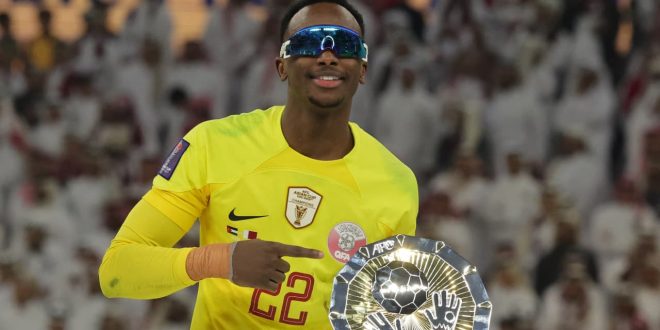 تدوال نشطاء على مواقع التواصل الاجتماعي صورا ومقاطع فيديو للحظة تتويج حارس مرمى المنتخب القطري، مشعل برشم، لنظارة خلال عقب الفوز على المنتخب الأردني بنهائي بطولة كأس آسيا 2023.