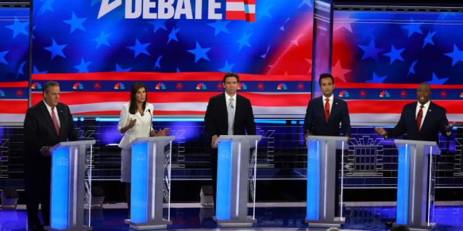 – المشاركون في المناظرة: حاكم فلوريدا رون ديسانتيس وحاكمة ولاية كارولينا الجنوبية السابقة نيكي هيلي وسناتور كارولينا الجنوبية تيم سكوت ورجل الأعمال فيفيك راماسوامي وحاكم ولاية نيو جيرسي السابق كريس كريستي)
